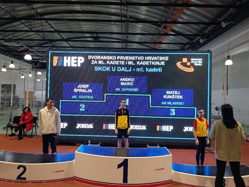 Ponosni smo na učenika 6.a razreda naše škole Andru Marića koji je osvojio prvo mjesto na Dvoranskom prvenstvu Hrvatske za mlađe kadete i kadetkinje. Andro je pokazao izvrsnu vještinu, spremu i brzinu u disciplini skok u dalj. Natjecanje se održalo u subotu 15.2.2026.  na Zagrebačkom velesajmu u organizaciji Hrvatskog atletskog saveza.