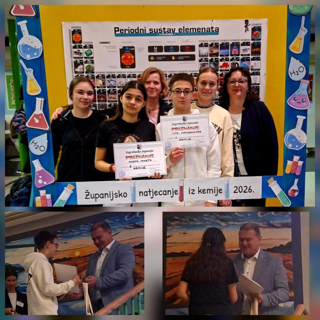 Na Županijskom natjecanju iz kemije, održanom 12.3.2026. u OŠ Milana Langa u Bregana, sudjelovali su učenici sedmih i osmih razreda. Sudjelovali su učenici sedmih razreda Vito Königshofer (7.c) i Jana Strahonja (7.f) uz mentoricu Nikolinu Novak, prof. biologije i kemije, te učenice osmih razreda Marta Miketa (8.b) i Lucija Oreški (8.e) uz mentoricu Đurđicu Patafta, prof. biologije i kemije. Svi su učenici pokazali visoku razinu pripremljenosti, logičkog razmišljanja i sposobnosti primjene kemijskih koncepata u zahtjevnim zadacima.